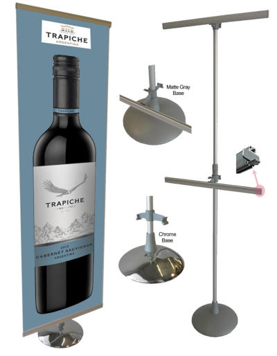 Poster Stand C, POST-CChrome or Matte Gray heavy disc base. Single or Double-Sided. High qualityaluminum, telescoping pole. Cross bars with removable adhesive slats allow foreasy poster-changing. Base weighs 13lbs. Available in 24” and 31.5”-wide by up to 74”-tall. Case qty: 10.