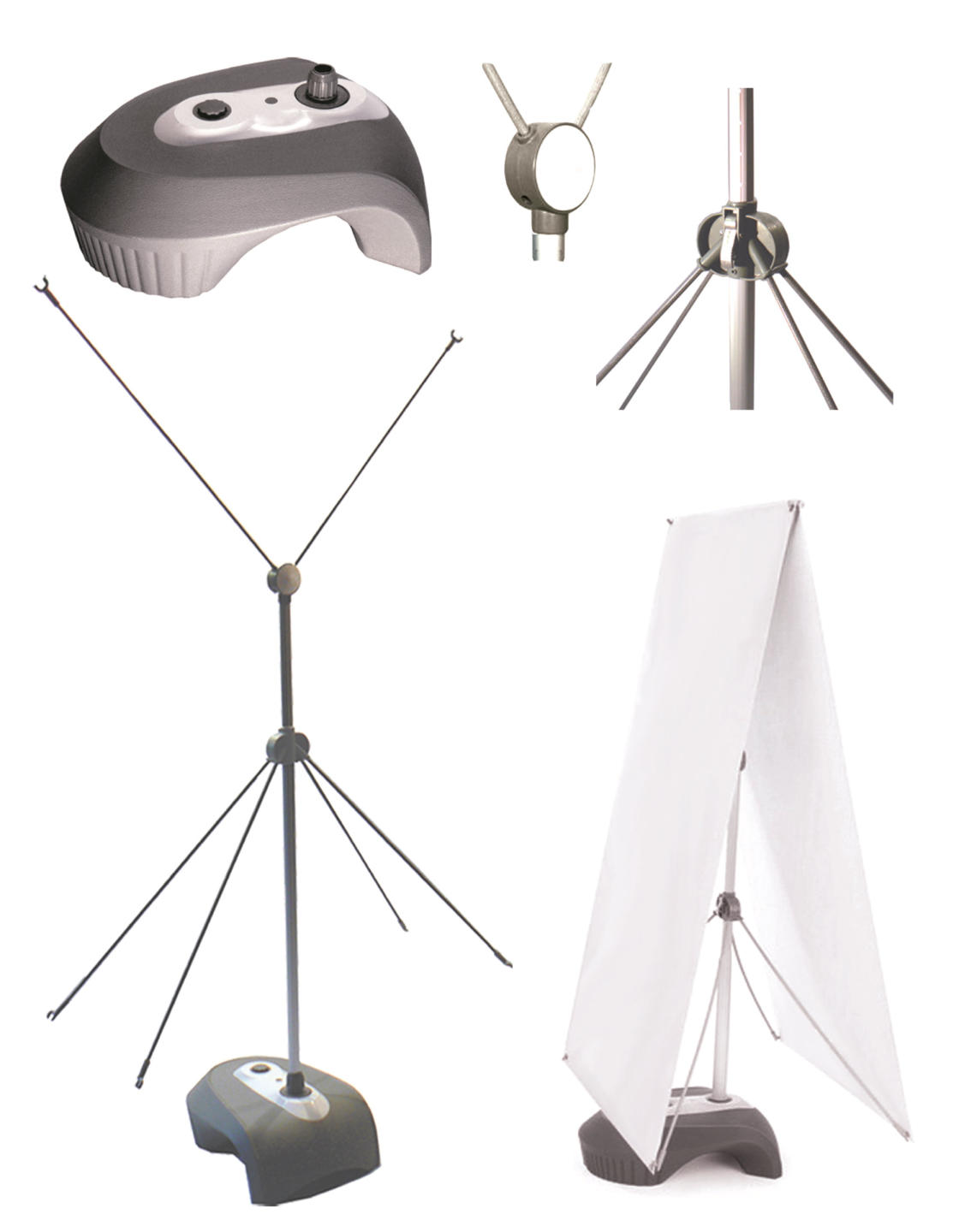 Outdoor X-Type Banner Stand, XBAN-OUTSingle or double-sided, adjustable height X-type stand with water/sand tank base. Back legs removable for single-side use. Thick aluminum, telescoping center pole and flexible fiberglass arms. The bottom hub uses a strong, sliding height adjustment lock. The top hub raises both poles at the same time for easy banner attachment. Poles and Base ship in 2 different boxes. Case qty: 10.