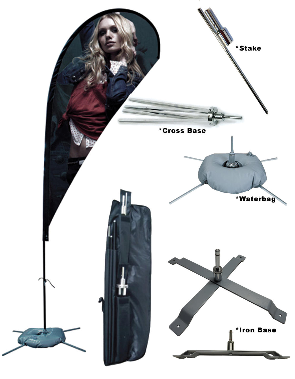 Flying Banner Stand; FLYBANStainless steel and fiberglass rotating stand. Teardrop style. Not plastic like many other cheaper versions. Heavy stainless-steel Cross Base comes standard, and and be changed for the Stake or Iron Base. Includes a deluxe case. Sizes: 84”, 134” or 173” tall.
