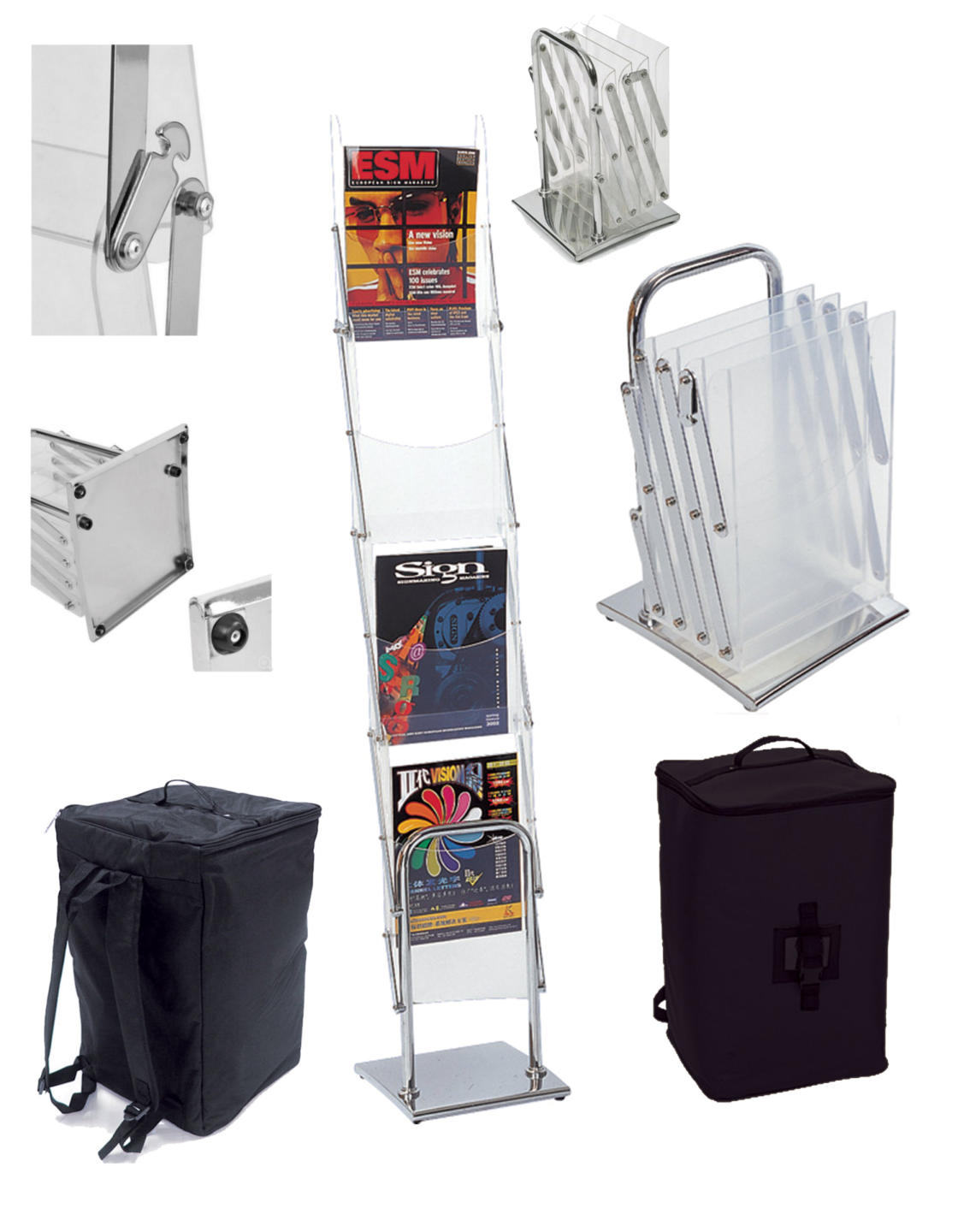 Portable Brochure Stand; PBS-4A locking chromed stainless-steel frame and heavy-duty base with 4 clear acrylic brochure holders. Each brochure holder is 9”-wide and 14”-tall. Comes with a backpack carrying case. Brochures can be carried in the unit while it is collapsed inside its case.