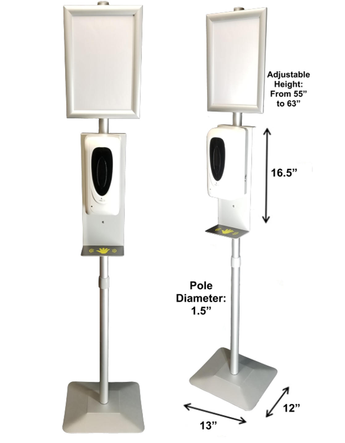 Hand Sanitizer Post, POST-HSSTouchless Hand Sanitizer Post with adjustable height pole and Snap Frame sign holder. The brushed aluminum stand has a heavy-duty 1.5” diameter pole and a 6.5 pound steel base. Motion-sensing dispenser is battery-operated. Snap Frame opens on all four sides and includes a clear acetate cover sheet. Case qty: 1