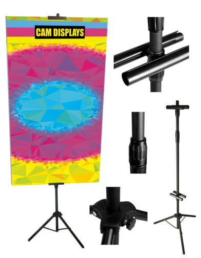 Poster Board Stand M2, POST-M2Board Stand Tripod, double-sided, adjustable from 12” up to 74" tall. For holding boards up to ½” thick. Displays board from 12” to 42” off the ground. Extra strong and lightweight. Cloth bag with handles. Case qty: 20.