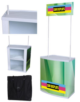 PromoBooth; POP-TABMolded plastic counter top is great for temporary, spot promotions. Makesa strong impact with less than 18 pounds. The bottom table holds graphics that have a wrap-around width of 64” and 33.5” height. The top board holds graphics 30” wide by 11” tall. An inner shelf and bottom molded plastic base are included. Comes in a large black nylon canvas bag with straps.