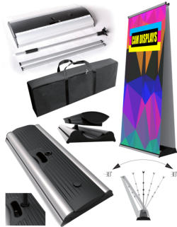Outdoor Roll Up, ROLLSC-33OOutdoor Roll Up designed to withstand light wind and rain. Double-sided retractable with a removeable water-tank base. Spring-flex adjustable height support pole. Comes with a deluxe padded carrying case and box.