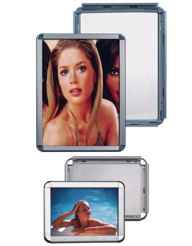 Snap Frames, SPFChrome and brushed aluminum frame. All four sides snap open and shut firmlyonto a white backboard. A clear acetate sheet is included to help protect the graphic. Five image sizes available. Case qty: 5