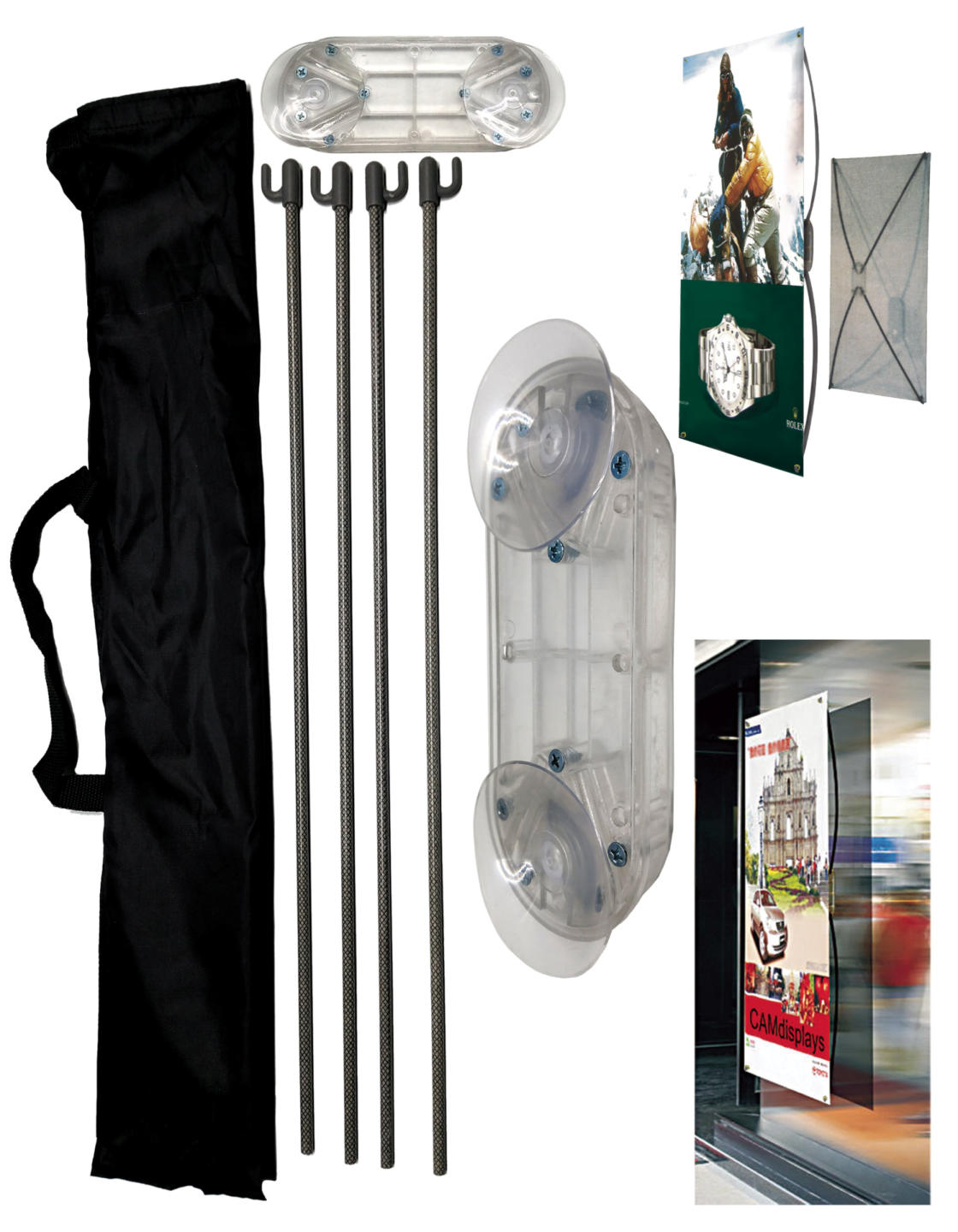and tension 18” by 48” banners. Includes a carrying case with handles. The