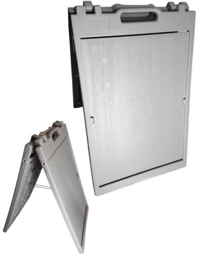 A-Frame Plastic Outdoor ALS-WHeavy-duty Sidewalk A-Frame sign-board holder. Securely holds 24"x36" boards with top and bottom slots and side tabs. Double-Sided. Color: Light Gray. Can be filled with water. Thick top handles.