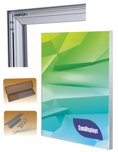 Fabric Frame, FRMFAB-A1 & FRMFAB-A023.5" x 33.5" (A1) and 27.5" x 39" (A0) Aluminum tension frame, double-sided. Machine-mitered corners. Designed for fabric with silicon or PVC edging. Highest-quality, thick aluminum frame.