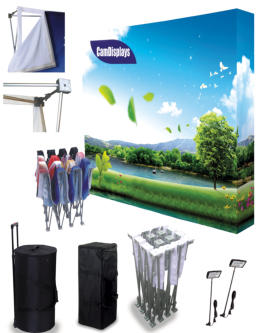 Fabric Pop-Up Display Wall, DWFABHigh quality straight aluminum locking frame includes pre-attached 2”-wide hook and loop strip. Comes in three sizes: FAB2=5 feet wide x 5 feet tall, FAB3= 7.5 feet wide x 7.5 feet tall, or FAB4=10 feet wide x7.5 feet tall. Snap-lock ABS connectors and leveling feet. Available with canvas duffle bag or wheeled luggage case. Case includes 2 halogen lights (150watts).