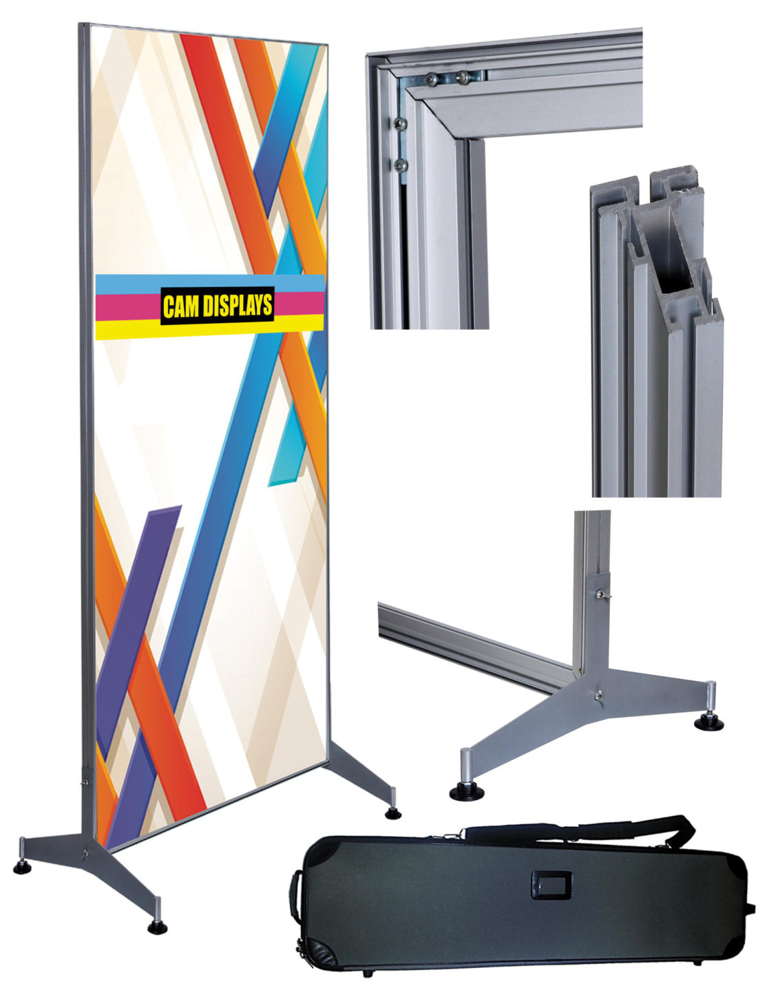 Fabric Frame Stand, FRM33-STD & FRM39-STDTwo Sizes: 33"x84" and 39”x84” Aluminum tension frame, double-sided. Designed for fabric with silicon or PVC edging (SEG). High quality thick aluminum frame comes in a deluxe Gray Luggage Case with wheels.