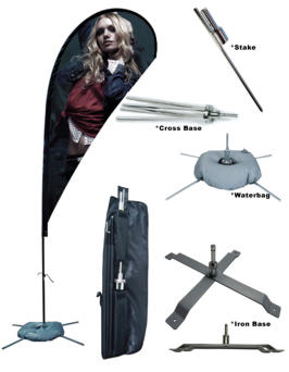 Flying Banner Stand; FLYBANStainless steel and fiberglass rotating stand. Teardrop style. Not plastic like many other cheaper versions. Heavy stainless-steel Cross Base comes standard, and and be changed for the Stake or Iron Base. Includes a deluxe case. Sizes: 84”, 134” or 173” tall.