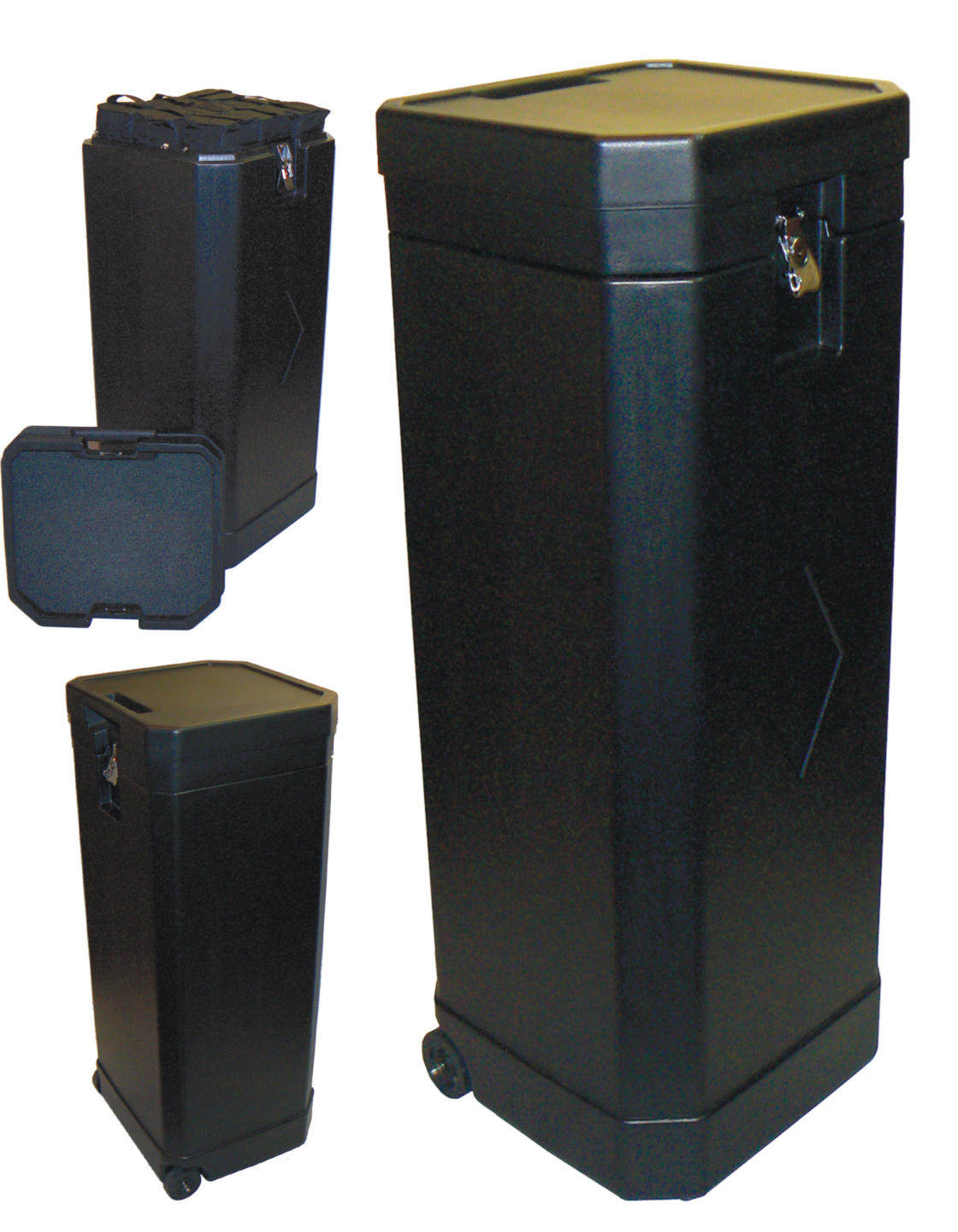 Hard Square Case; HSCMolded PVC carrying case with wheels and locking lid. Padded interior. Can beused as a podium. Holds up to 9 regular 33” Roll Ups. Thick PVC plastic can beshipped or checked as luggage. Size: 38” x 16” x 15”