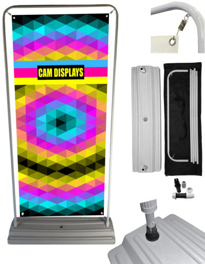 the base. Hook springs connect the banner to each corner. Comes with a black,