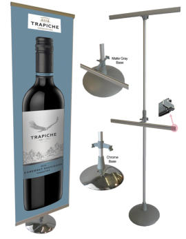 Poster Stand C, POST-CChrome or Matte Gray heavy disc base. Single or Double-Sided. High qualityaluminum, telescoping pole. Cross bars with removable adhesive slats allow foreasy poster-changing. Base weighs 13lbs. Available in 24” and 31.5”-wide by up to 74”-tall. Case qty: 10.