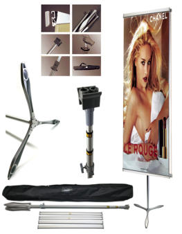Poster Stand D, POST-D1Double-sided straight poster hanger with a zinc-metal, folding tri-base. Height is fully adjustable with a total poster size of 24” wide by 18” to 88“ tall. Posters can be displayed up to 28” off the ground. Crossbars securely clamp the poster at top and bottom. The center support pole is telescopic and spring-loaded to keep the banner taut. The top bar holder has two D-Lamp supports. The tri-base has rubber-pad feet. Deluxe padded carrying case included. Case qty: 10.