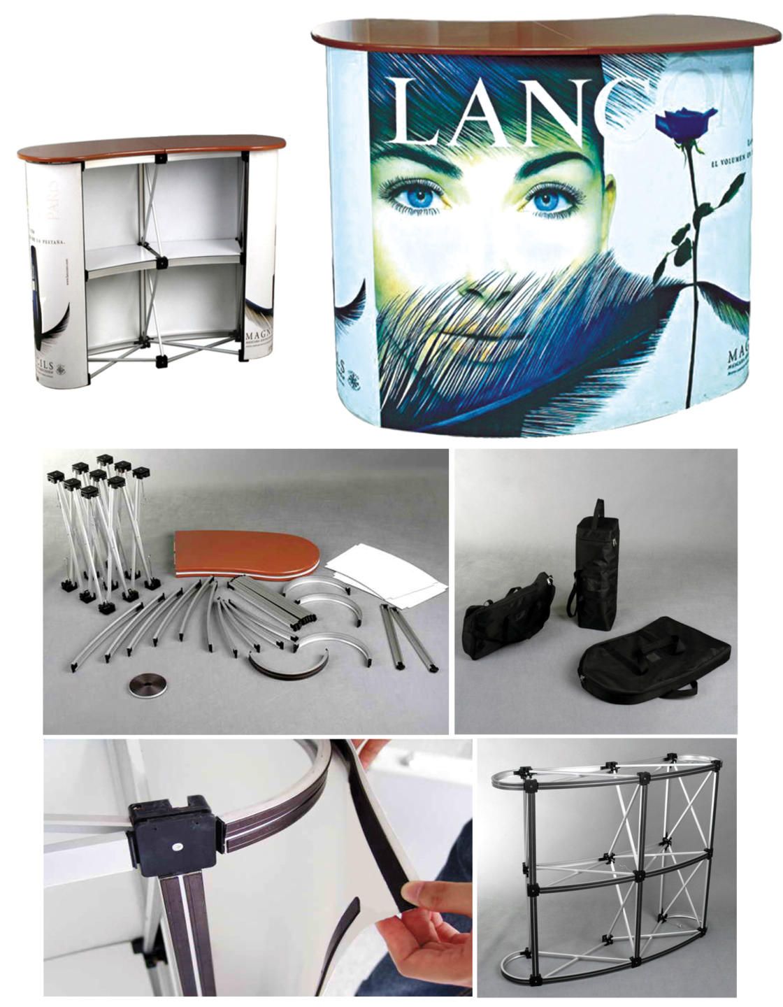 PromoCounter; PCFPopUp PromoCounter has a heavy solid composite resin top with a beautiful finish that comes in 2 styles. Magnetic bars add structural integrity as well as provide a surface to attach the white PVC backer panel. A hard plastic shelf sits inside. PVC backer panel holds graphics sized 78” wide x 37” tall. Total height with countertop is 38”.