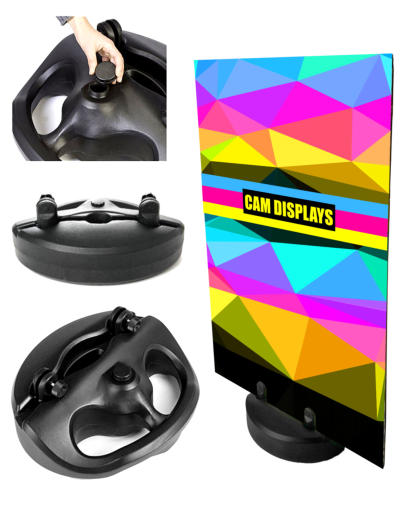 Watertank Board Base, WBBClamping rigid board holder. Water tank base weighs 33 pounds when filled with water or dry sand. Quick install and change-out. Thick molded black plastic base and board clamps. Holds rigid boards 14"-42" wide by up to 60" tall indoors or 48" outdoors. Case qty: 5.