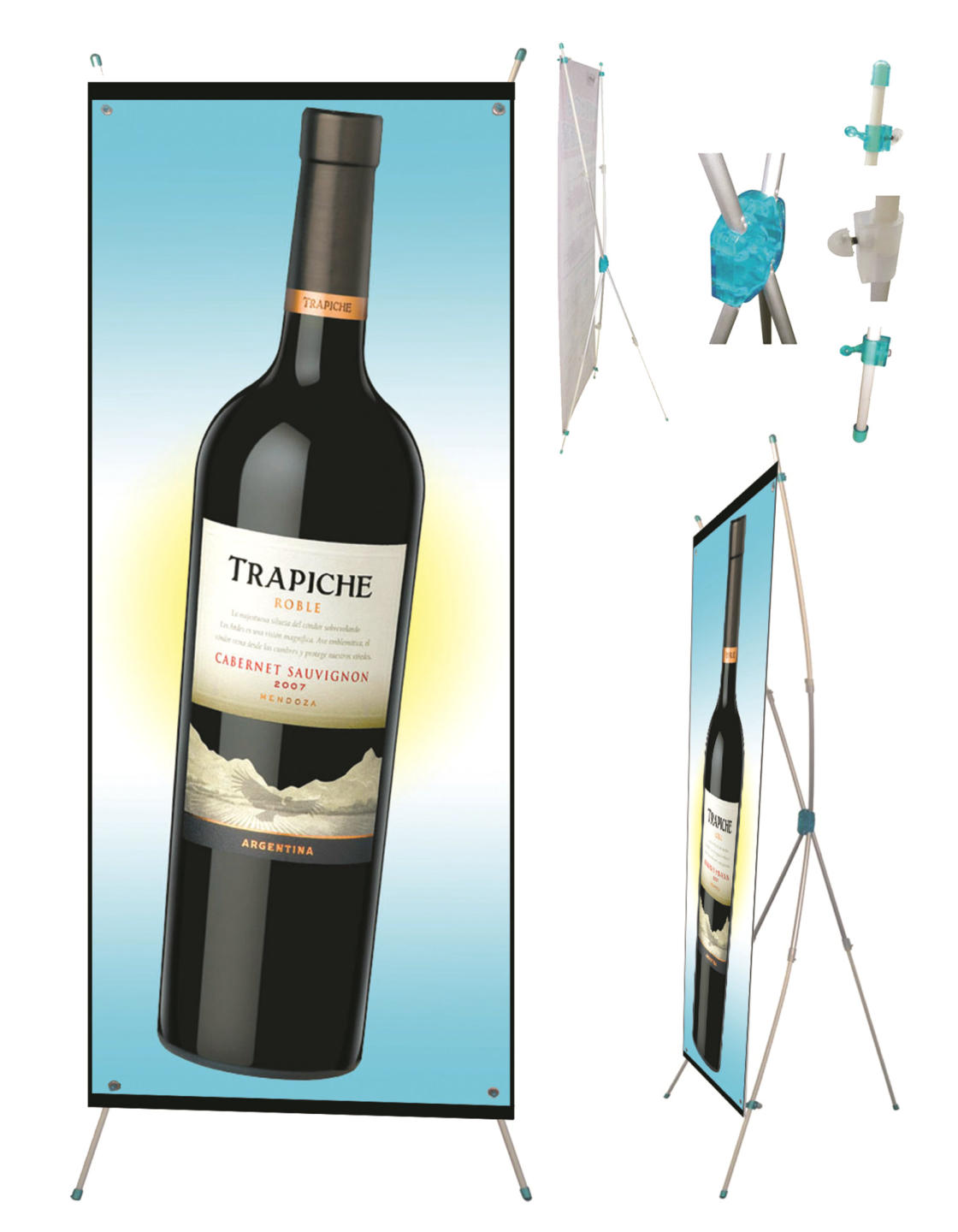 hold banners from 18” up to 38” wide, and from 59” up to 72” tall. It collapses