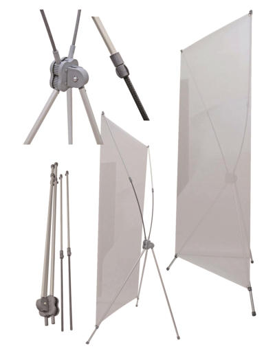 X-Type Banner Stand; XBAN-F & XBAN-F2The X-Banner F & F2 are highly adjustable stands for banners with grommets. Telescoping aluminum and fiberglass arms, and a strong PVC hub with locking gears support a wide range of banner sizes. The back support pole also adjusts to change the display angle. The F2 supports a full 4’ by 8’ banner, the largest in its class. It comes with a deluxe zippered carrying case. Case qty: 10.